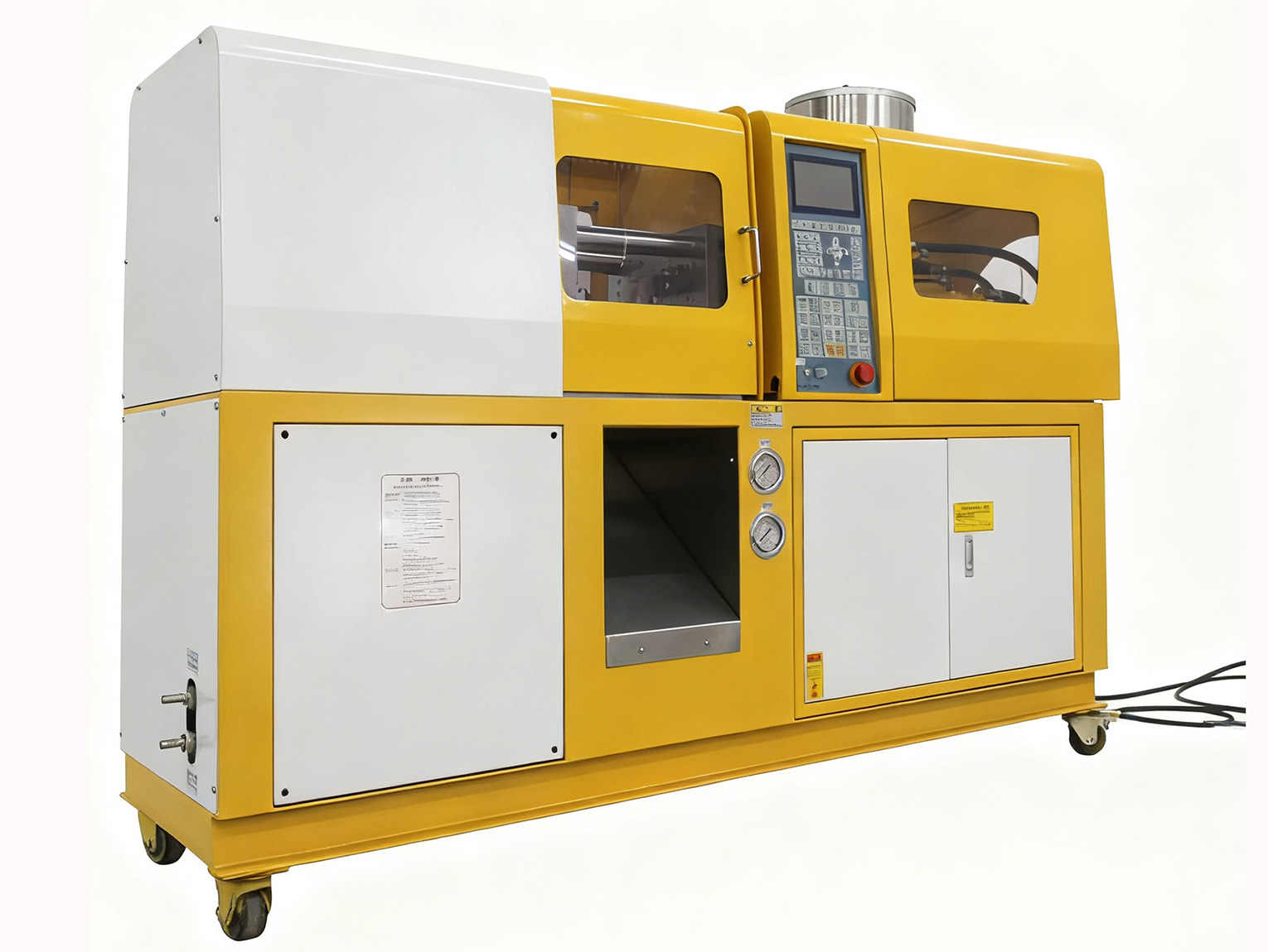 - 脚垫老化 / 缺失:机身底部橡胶脚垫(缓冲部件)开裂、硬化或缺失,无法吸收注塑冲击力,振动直接传递至地面,表现为振动频率与注塑节奏一致。