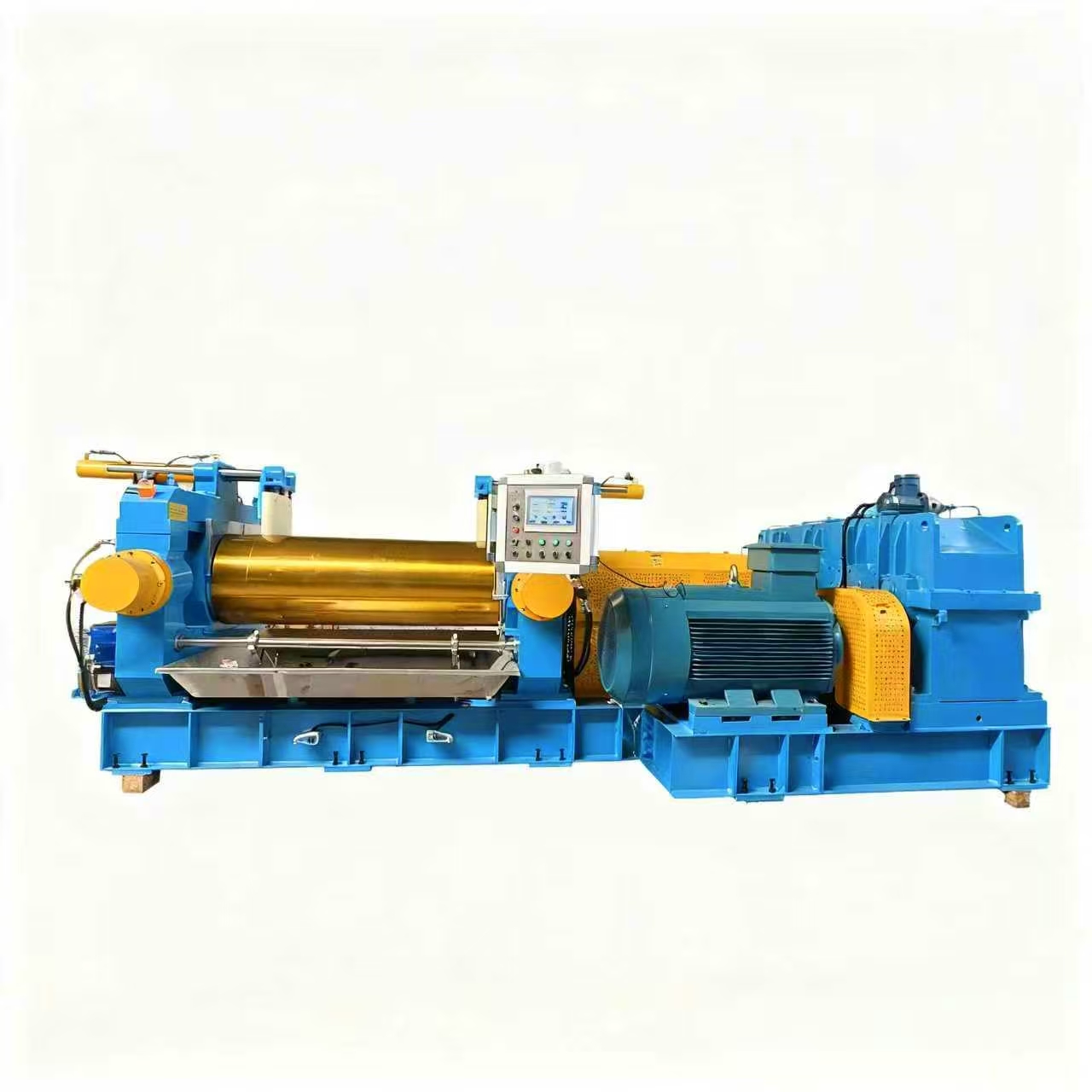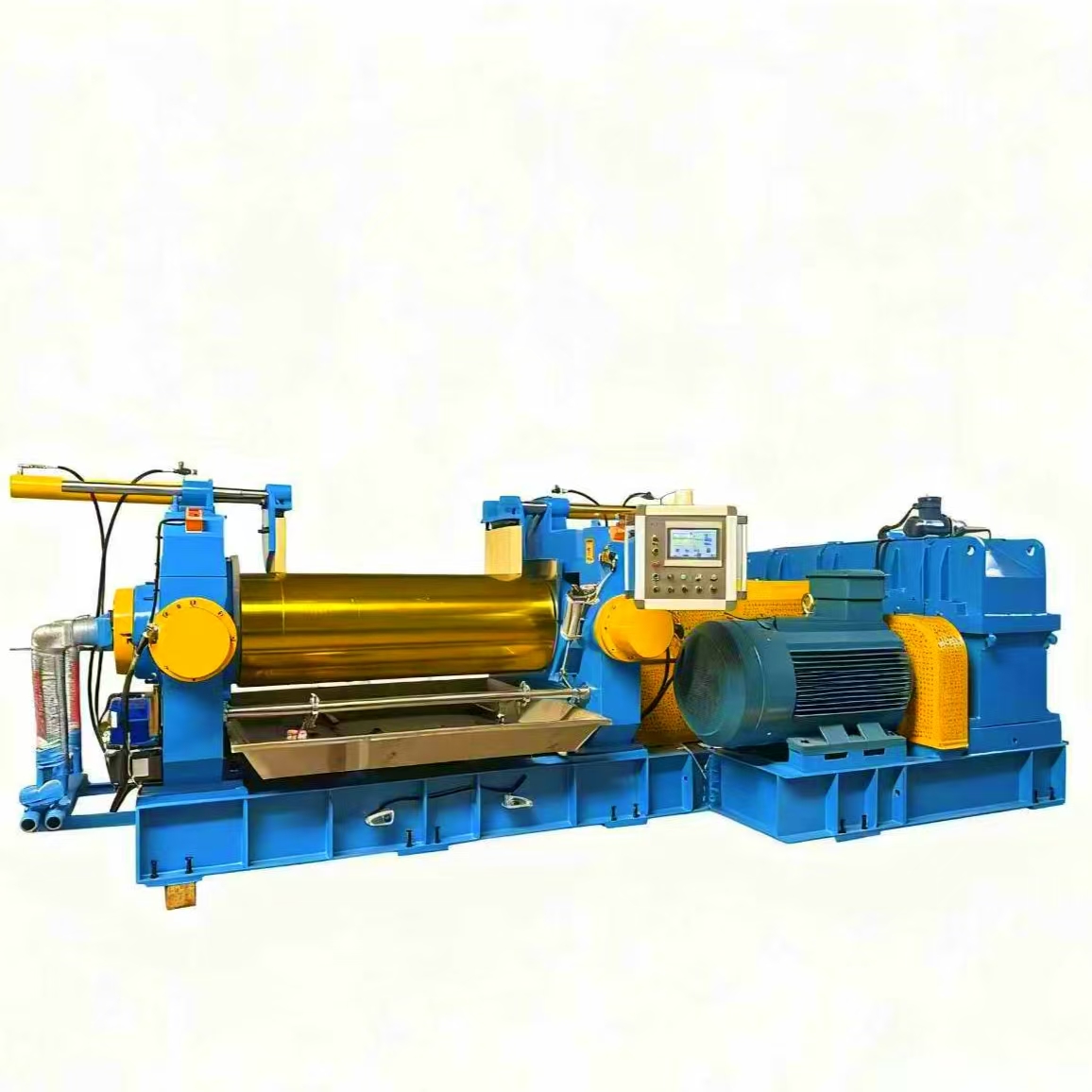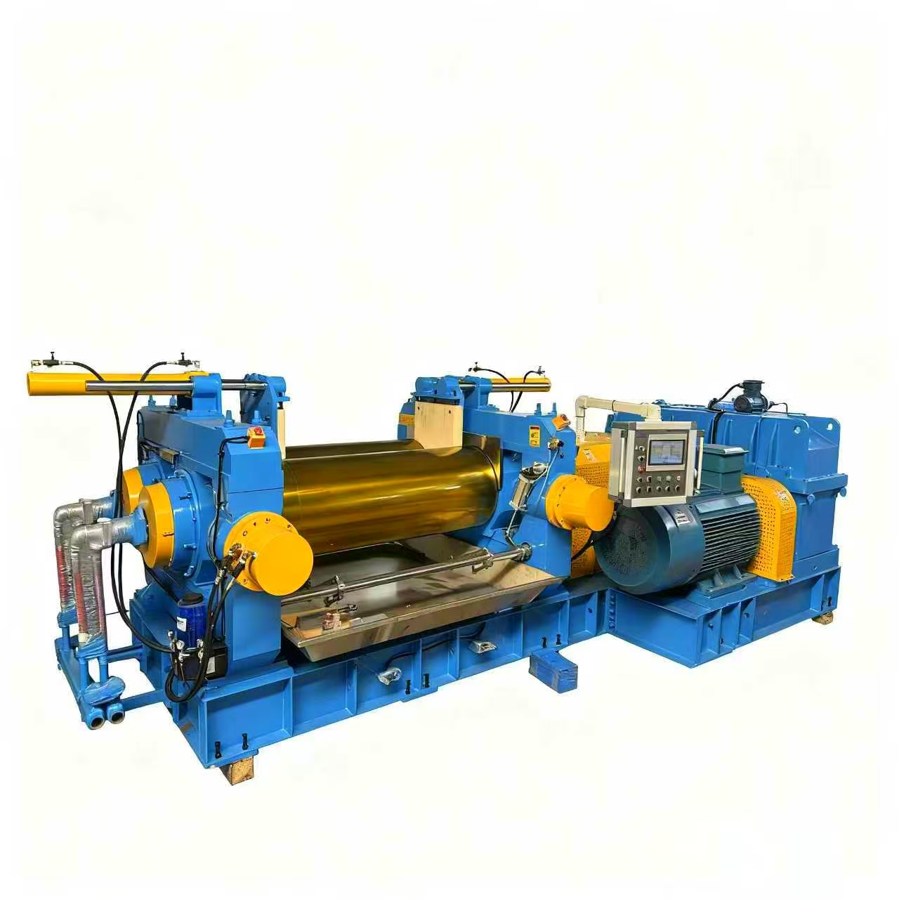 变频调速系统实现 0-30r/min 辊速无级调节,适配不同原料特性;液压调距与智能控温联动,确保每批次炼胶厚度偏差≤0.1mm、温度波动≤±1℃,成品合格率提升至 98% 以上。