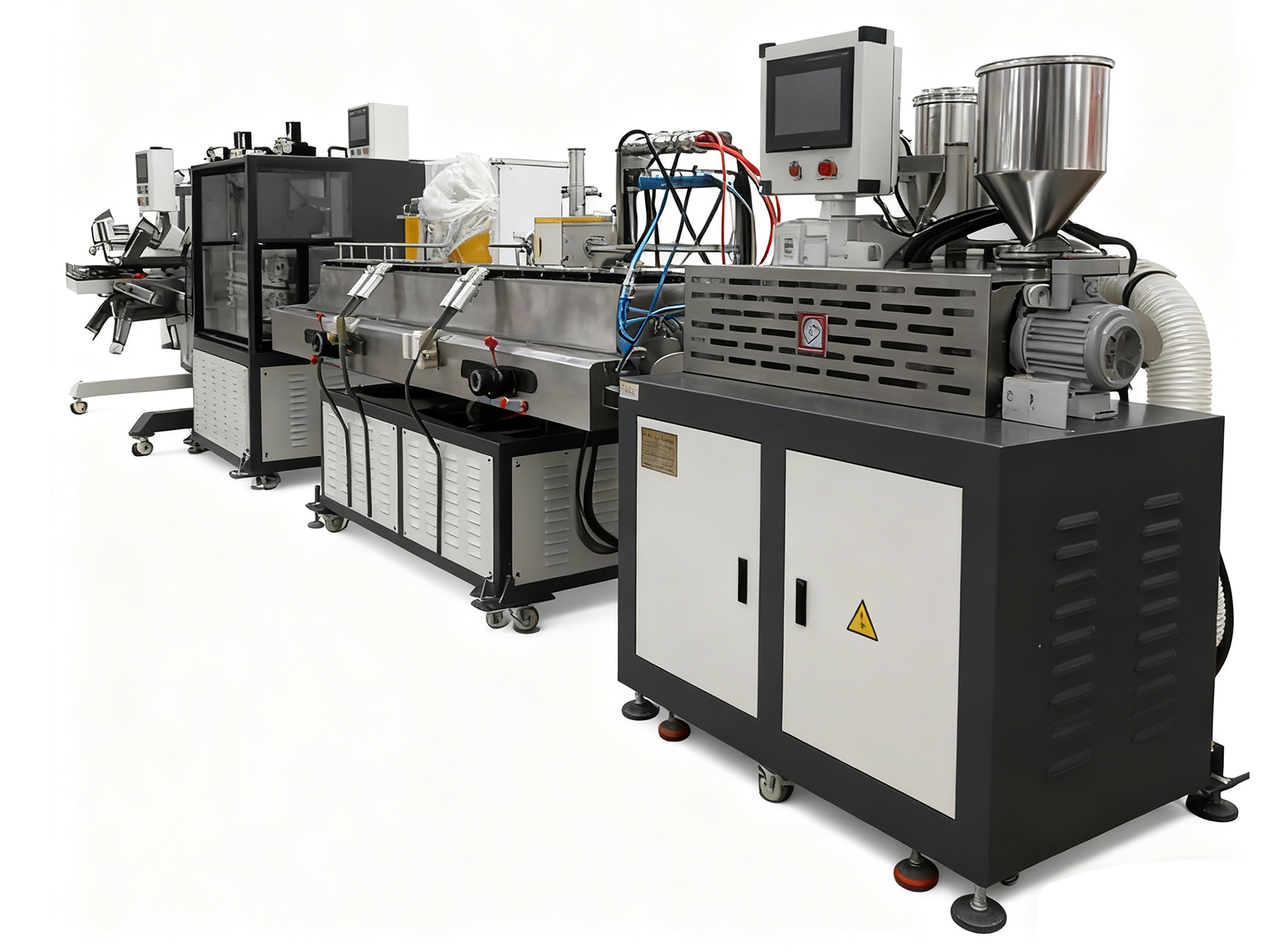 - 原料预处理与喂料:将待加工物料(如 PE 颗粒、PVC 粉料、高分子助剂混合物)按配方混合干燥后,投入精准定量喂料装置 —— 装置配备防架桥搅拌结构,可按设定速率稳定送料,避免物料结块导致的喂料不均,从源头保障制管稳定性;